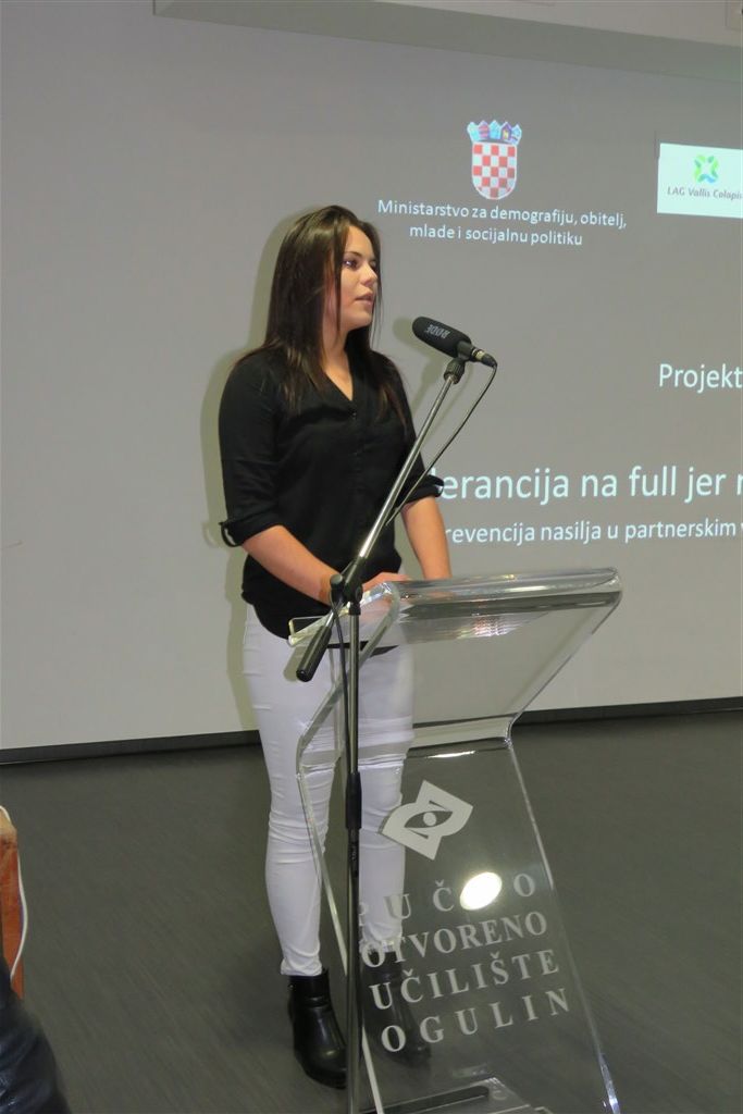 Predavačica je bila Sara Salopek, koja je završila edukaciju za trenera u sklopu projekta “Tolerancija na full jer nasilje nije cool”, koja je svoje dobro tempirano i za ovakav profil publike prilagođeno, predavanje održala pred skoro popunjenom malom dvoranom. Nakon predavanja Sara Salopek je odgovorila i na nekoliko pitanja prisutnih sugrađana, primila pohvale, te nekoliko sugestija i prijedloga.
