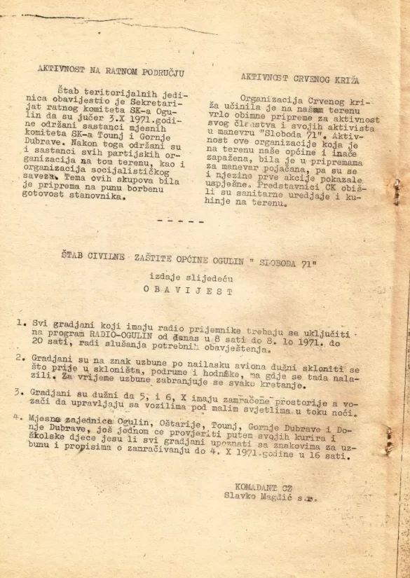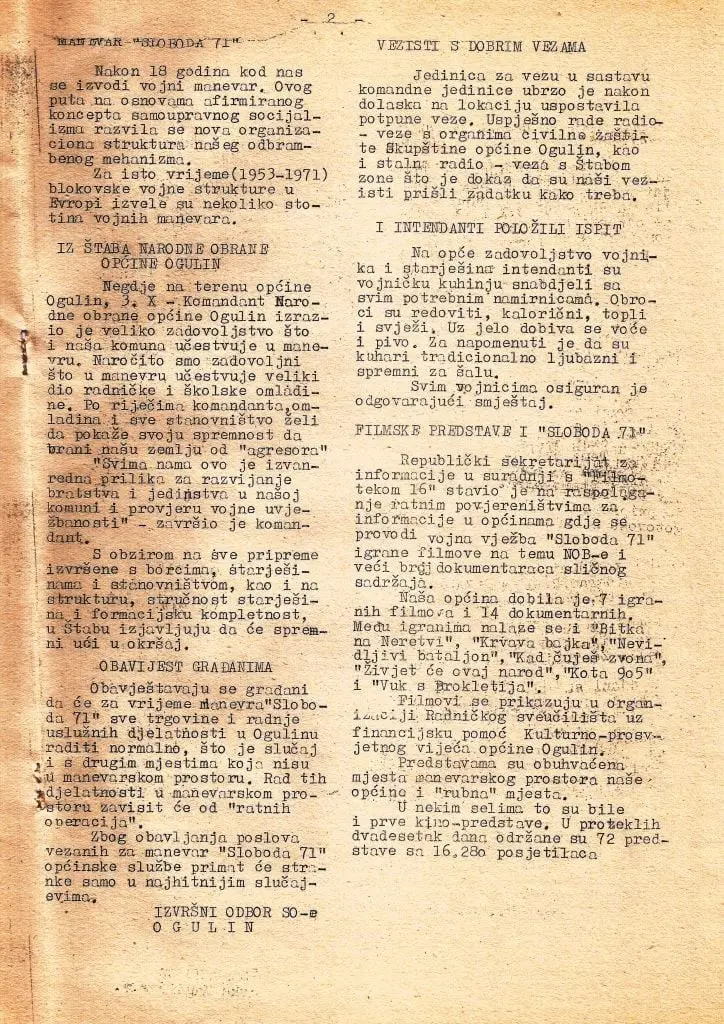 Prema scenariju vježbe, civilni republički i lokalni gradski organi vlasti su odmah trebali prijeći na zamišljeno ratno stanje i potom koordinirati općenarodnim otporom. Štab Narodnog odbora općine Ogulin ustrojio je Povjereništvo za informativnu propagandnu službu. Prema dobivenim uputstvima Povjereništvo je bilo dužno organizirati i voditi propagandu djelatnost u stvarnoj ratnoj situaciji. Informativno propagandna djelatnost vršila se preko radijskih medija, proglasima, prikazivanjem filmova i izdavanjem specijalnih novinskih izdanja.