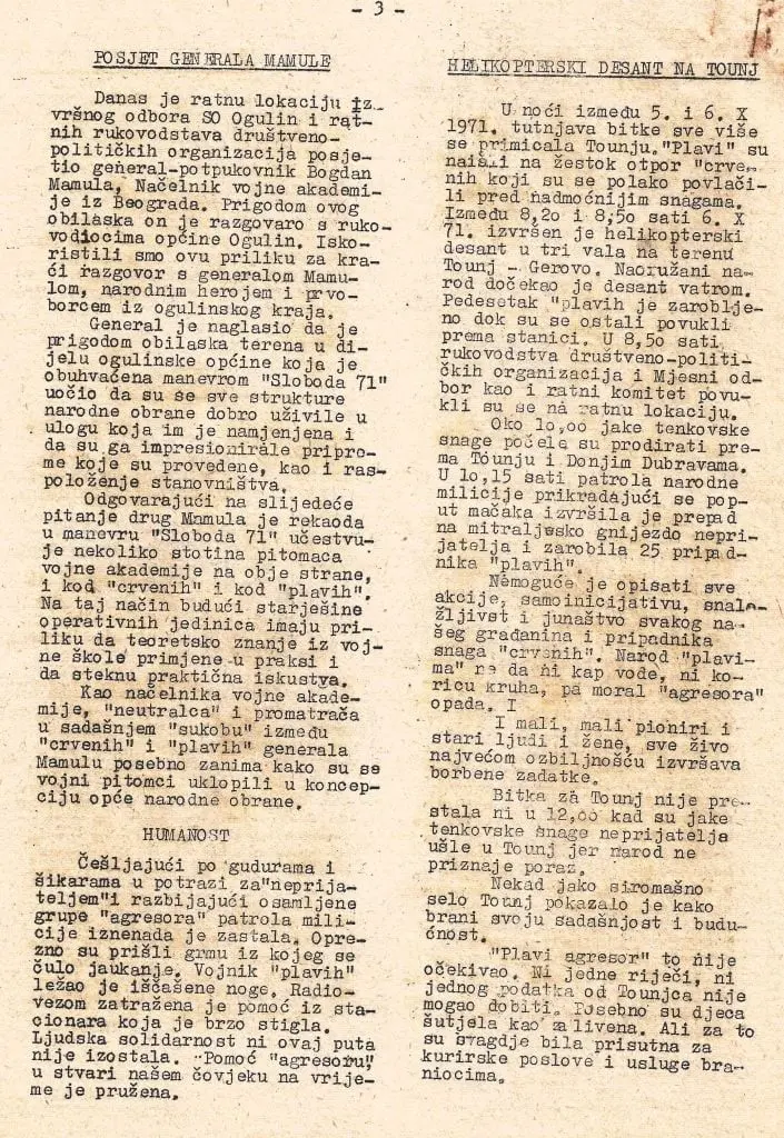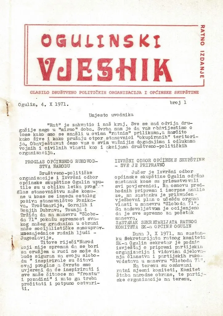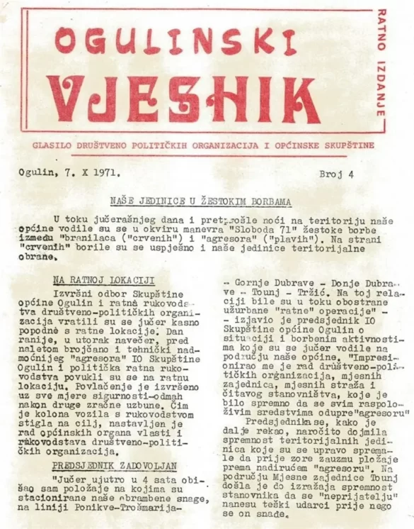 O Ogulinskom vjesniku, svojevrsnom “ratnom novinskom izdanju” govori se danas u Facebook objavi Zavičajnog muzeja Ogulin.