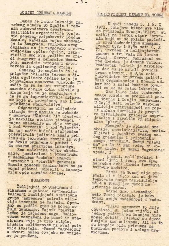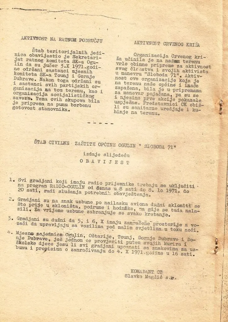 U takvom političkom okruženju na prostoru tri jugoslavenske republike Slovenije, Hrvatske i Bosne i Hercegovine održana je od 2. do 9. listopada 1971. godine vojna vježba pod nazivom „Sloboda 71“. Vježba je, pored provjere spremnosti vojnih snaga, trebala poslužiti za plašenje onih koji su tražili reforme u bivšoj Jugoslaviji, ponajprije hrvatskih proljećara. Jedna od vježbi održana je na prostoru mjesnih zajednica Ponikve, Trošmarija, Tržić, Tounj te Gornje i Donje Dubrave, koje su bile dio nekadašnje općine Ogulin.