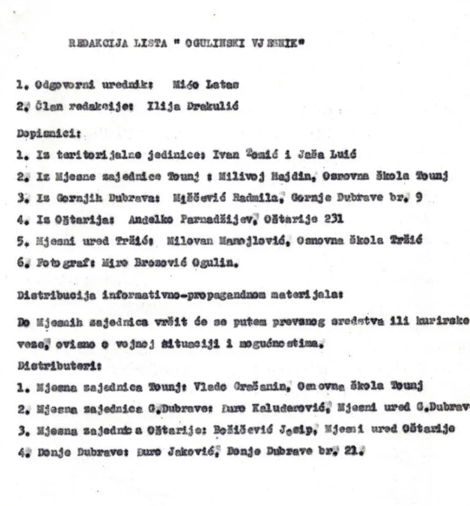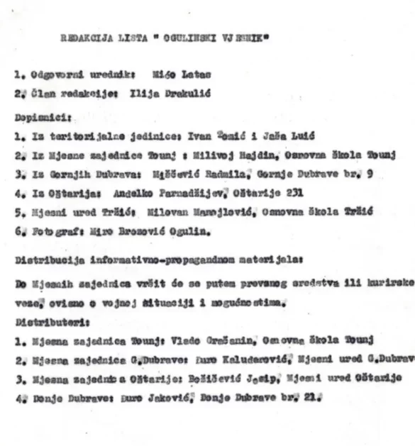 U tu svrhu je pokrenuto izdavanje Ogulinskog vjesnika. Tiskana su četiri broja u nakladi od 500 primjeraka koji su distribuirani na „front“ i gradskim organizacijama. Za voditelja Povjereništva imenovan je Mihael Sobolevski, tadašnji kustos Zavičajnog muzeja Ogulin. Povjerenstvo za informativno propagandnu službu sačinjavali su još Mićo Latas koji je bio urednik Ogulinskog vjesnika, Ilija Drakulić, Stjepan Spoja i Milka Sabljak.