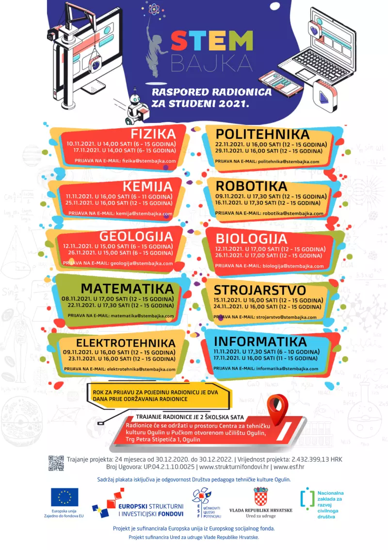 U sklopu projekta STEM BAJKA nastavljamo sa održavanjem radionica za djecu od 6 do 15 godina starosti, a prema rasporedu za mjesec studeni. Radionice će se provoditi u Centru za tehničku kulturu Ogulin pri Pučkom otvorenom učilištu Ogulin, ulaz iz Ulice Ivana bana Mažuranića, prvi kat.