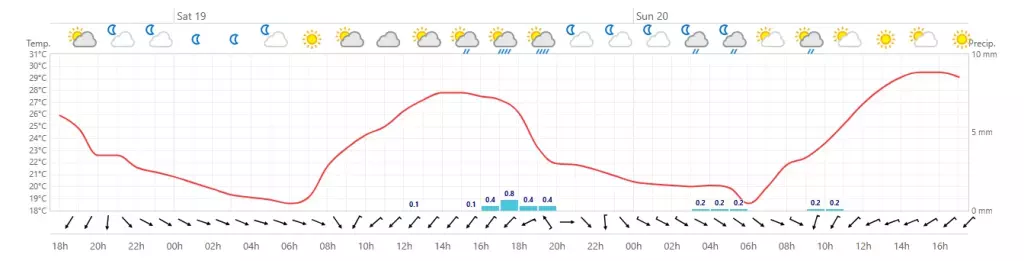 U subotu na Jadranu će većinom biti sunčano. U unutrašnjosti povremeno umjerena naoblaka, no uz jači razvoj oblaka pokoji pljusak te grmljavina očekuju se ponajprije na istoku, a poslijepodne i u dijelu Dalmacije. Vjetar slab do umjeren sjeveroistočni. Na Jadranu slaba i umjerena bura, podno Velebita i jaka, a danju na otvorenom moru sjeverozapadnjak. Jutarnja temperatura zraka od 14 do 19, duž obale između 21 i 26 °C. Najviša dnevna od 29 do 34 °C.