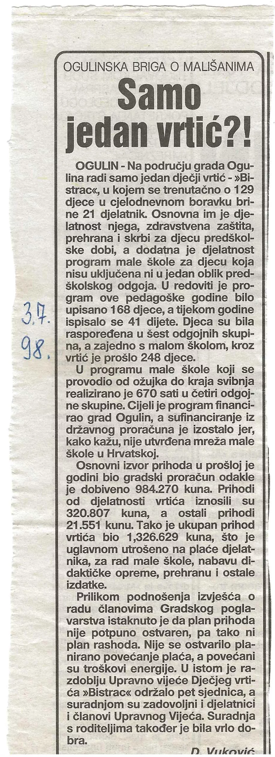 U srpnju 1998. godine u Večernjem je listu objavljen članak pod naslovom “Samo jedan vrtić?!”