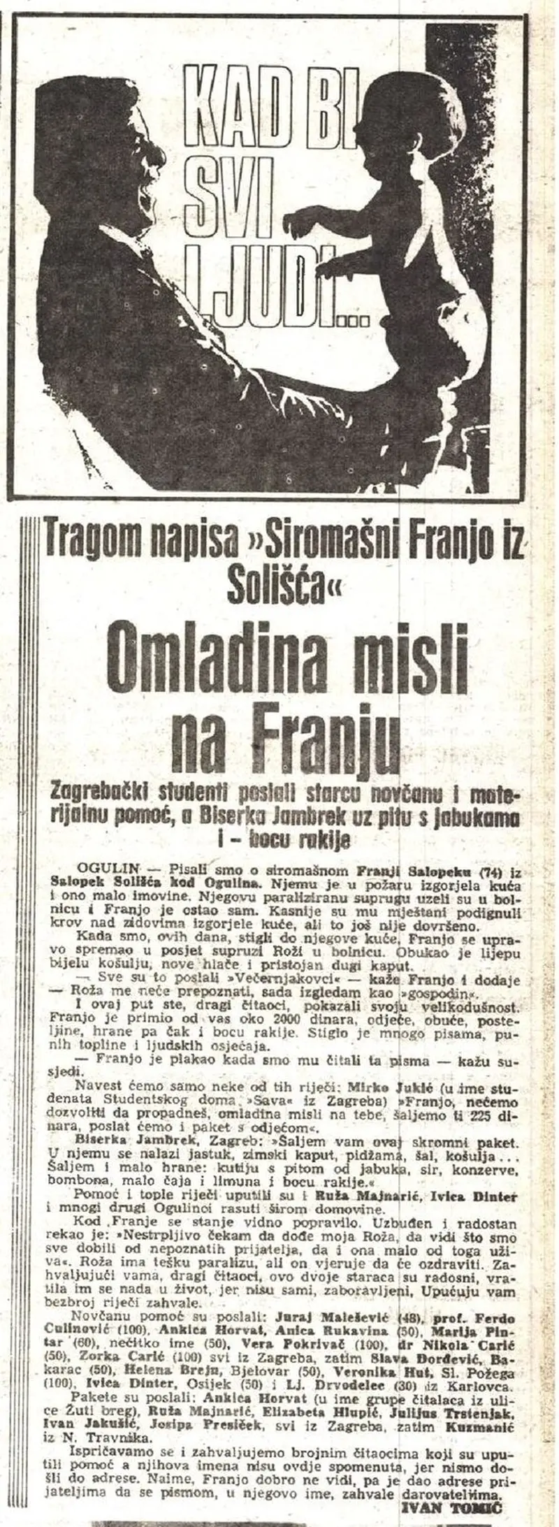 Ovom prigodom Zavičajni muzej Ogulin u rubrici Utorkom iz muzejskog arhiva donosi članak objavljen 20. veljače 1971. godine u Večernjem listu o pomoći Franji Salopeku iz Ogulina. Inicijativa za pomoć je pokrenuta u sklopu akcije Večernjeg lista „Kad bi svi ljudi…”, kojom se nastojalo potaknuti građane da pomognu ljudima koji su se iz raznih razloga našli u teškim životnim situacijama.