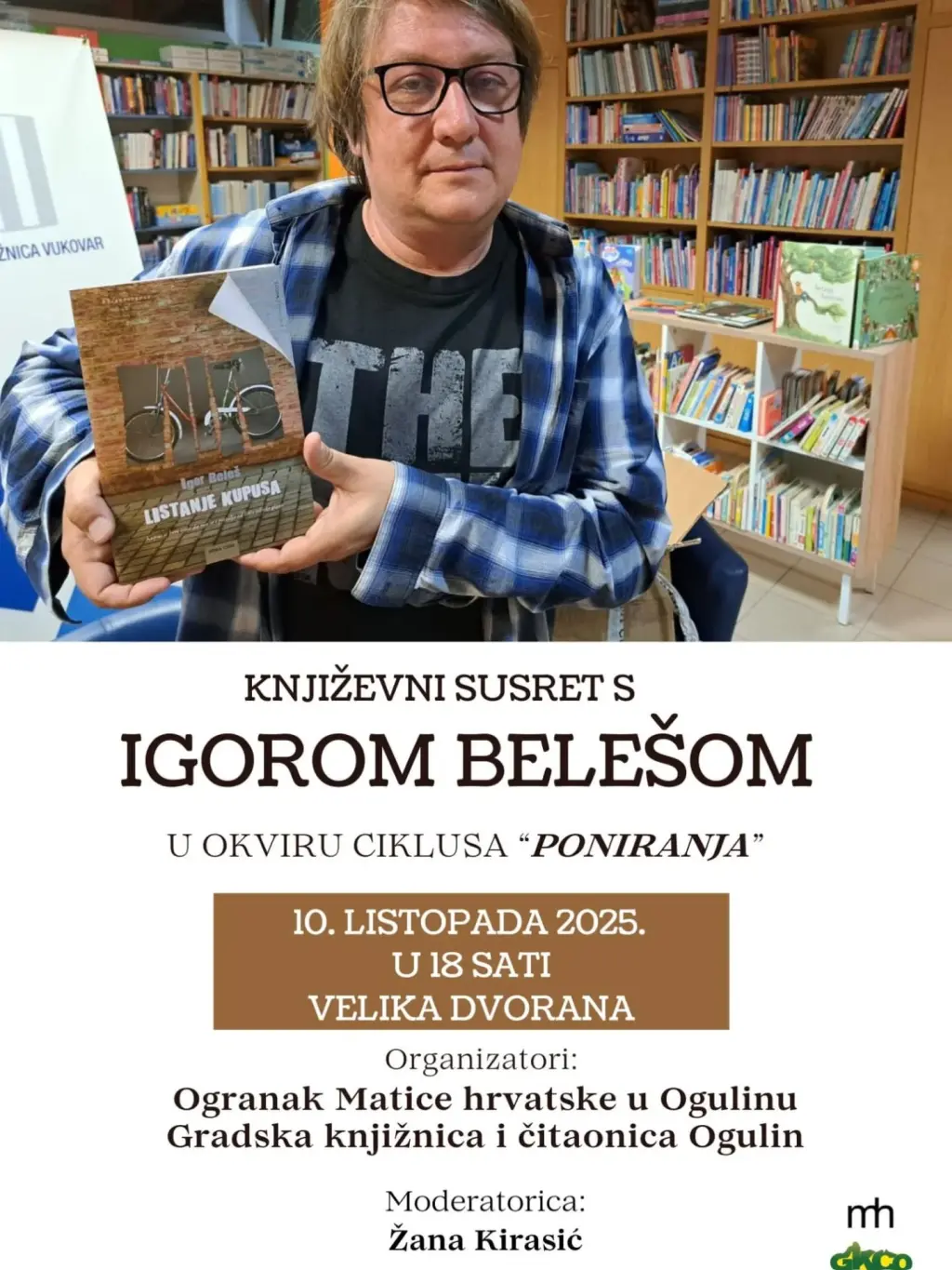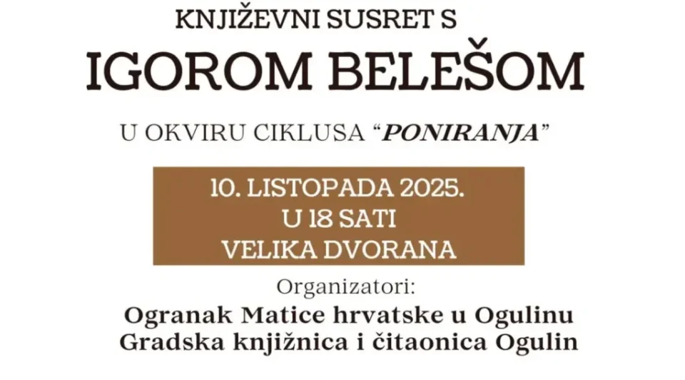 Gradska knjižnica i čitaonica Ogulin i Ogranak Matice hrvatske Ogulin pozivaju sve ljubitelje književnosti na poseban događaj – Književni susret s Igorom Belešom, autorom nagrađivanog romana Listanje kupusa. Susret će se održati u petak, 10. listopada u 18 sati u Velikoj dvorani Gradske knjižnice i čitaonice Ogulin, u sklopu ciklusa Poniranja.