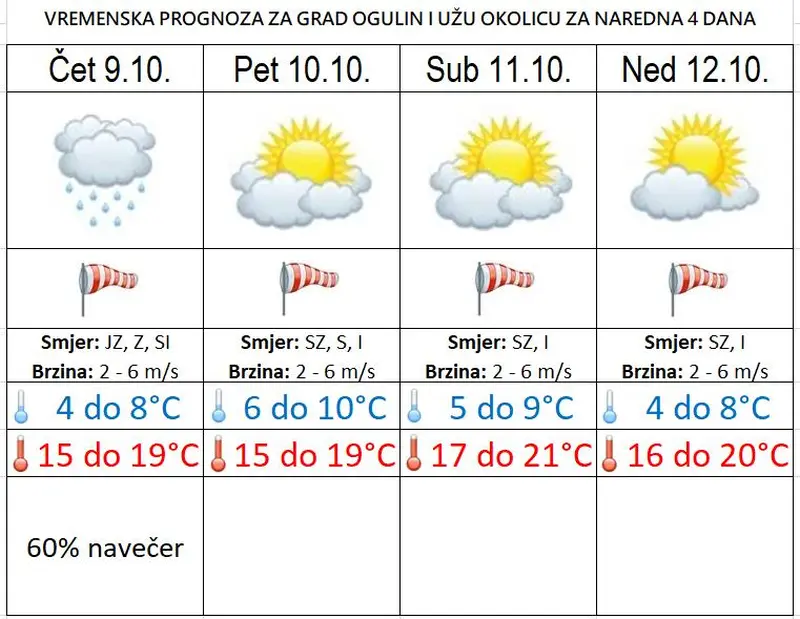 U subotu u većini predjela pretežno sunčano. U unutrašnjosti mjestimice umjerena, na istoku prolazno povećana naoblaka. Ujutro je lokalno moguća magla. Vjetar slab, na istoku i umjeren sjeverozapadni. Na Jadranu umjerena, u prvom dijelu dana i jaka bura te sjeverozapadni vjetar. Najniža temperatura zraka od 6 do 11, na Jadranu od 12 do 17 °C. Najviša dnevna uglavnom između 17 i 22, na Jadranu od 20 do 25 °C.