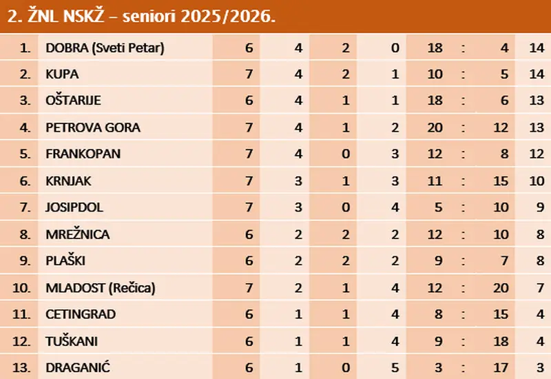 Na tablici nakon 7.kola vodi Dobra sa 14 bodova i utakmicom manje, Oštarije su treće sa 13, Josipdol sedmi sa 9, a Plaški deveti sa 8 bodova.