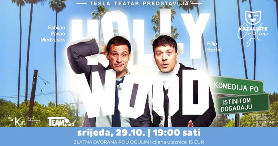 Nakon brojnih rasprodanih izvedbi diljem Hrvatske, kazališna uspješnica Hollywood stiže u Zlatnu dvoranu Pučkog otvorenog učilišta Ogulin. Ova duhovita i topla priča o snovima, prijateljstvu i borbi za uspjeh osvojila je publiku diljem zemlje, a sada će i Ogulinci imati priliku uživati u 65 minuta vrhunske zabave.