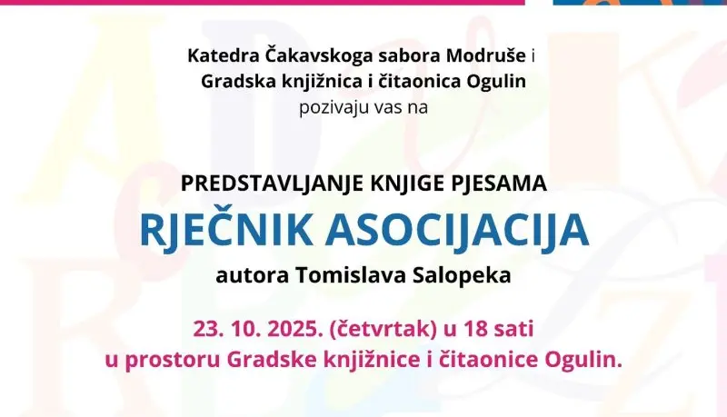 Katedra Čakavskoga sabora Modruše i Gradska knjižnica i čitaonica Ogulin organiziraju predstavljanje knjige pjesama „Rječnik asocijacija” autora Tomislava Salopeka. Događanje će se održati večeras, s početkom u 18 sati, u prostoru Gradske knjižnice i čitaonice Ogulin.
