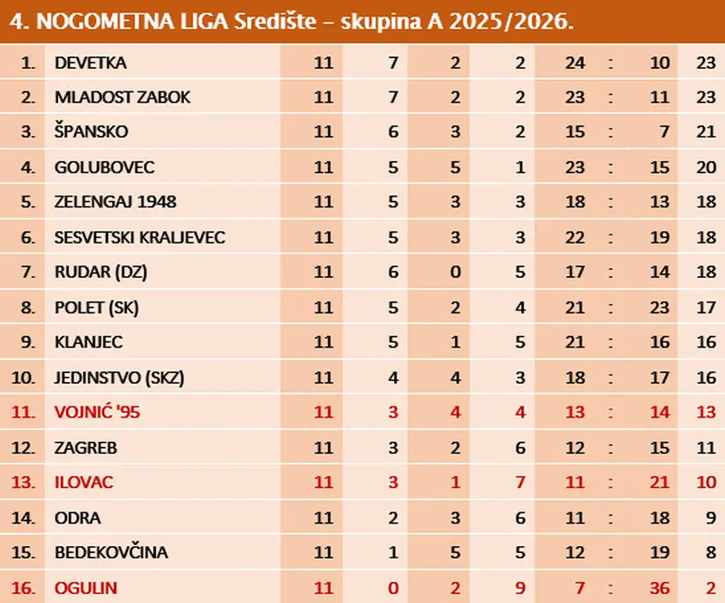 Nakon 11.kola nogometaši Ogulina su na posljednjem 16.mjestu sa samo 2 boda, odnosno sa samo dva neriješena rezultata i čak 9 poraza. U 12.kolu sljedeće subote nogometaši Ogulina gostuju kod 3-plasirane momčadi Španskog.