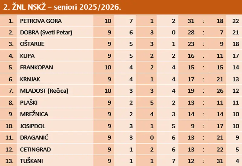 Na tablici nakon 10.kola vodi Petrova Gora sa 22 boda, Dobra je druga sa 21 bodom i utakmicom manje, Oštarije su treće sa 18, Plaški je osmi sa 11, a Josipdol deseti sa 10 bodova.