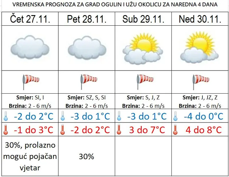 U subotu djelomice, na većem dijelu Jadrana i pretežno sunčano. U istočnoj Slavoniji uz više oblaka mjestimice slaba kiša ili susnježica, uglavnom u prvom dijelu dana. Ujutro lokalno moguća magla. Vjetar slab, ponegdje do umjeren sjeveroistočni, na istoku sjeverozapadni. Na Jadranu umjerena do jaka bura, podno Velebita u noći i ujutro s olujnim udarima, postupno će slabjeti. Najniža temperatura zraka uglavnom od -4 do 1 °C, a na Jadranu od 4 do 9 °C. Najviša dnevna između 4 i 7 °C, a na Jadranu 12 i 14 °C.