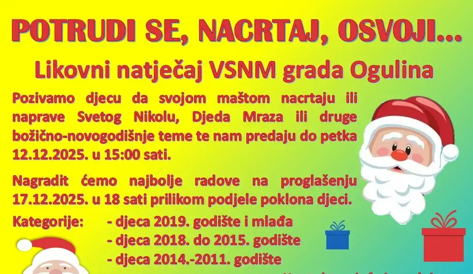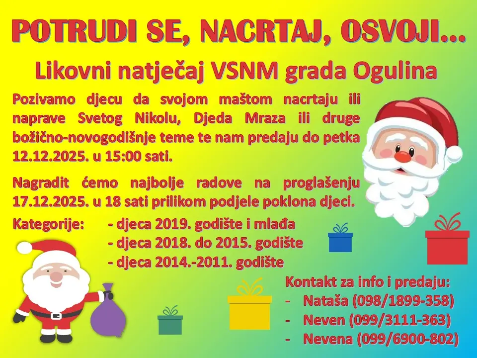 VSNM poziva djecu da se prepuste svojoj mašti i nacrtaju, ili naprave, Djeda Mraza, Svetog Nikolu, ili neku drugu božićno novogodišnju temu, te rad predaju do 12.12.2025. godine do 15:00 sati organizatorima natječaja, koji je organiziran u tri kategorije starosti: najmlađa kategorija djeca rođena 2019. godine i mlađa, srednja kategorija za djecu rođenu od 2015. do 2018. godine i starija grupa za djecu rođenu 2011. do 2014. godine.