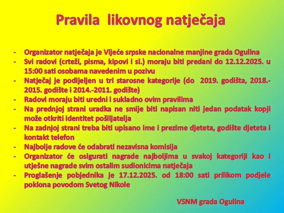 Vijeće srpske nacionalne manjine grada Ogulina organizira božićno-novogodišnji dječji likovni natječaj. Osigurane su nagrade za najbolje, te utješne nagrade sa sve ostale sudionike.