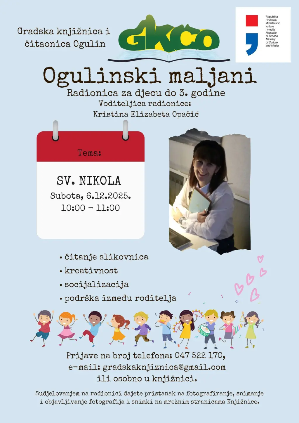 Adventska radionica „Ogulinski maljani“ za djecu do 3. godine održat će se u subotu, 6. prosinca 2025. s početkom u 10 sati u Igraonici za maljane Gradske knjižnice i čitaonice Ogulin.
