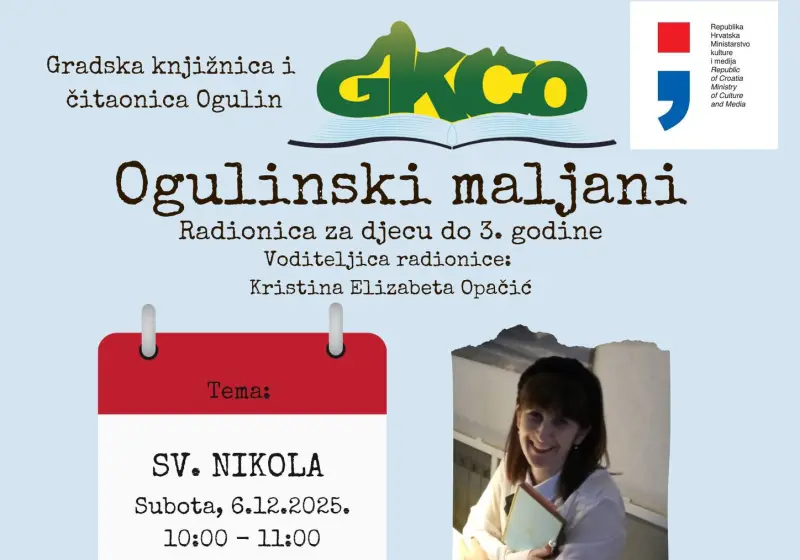 Adventska radionica „Ogulinski maljani“ za djecu do 3. godine održat će se u subotu, 6. prosinca 2025. s početkom u 10 sati u Igraonici za maljane Gradske knjižnice i čitaonice Ogulin.