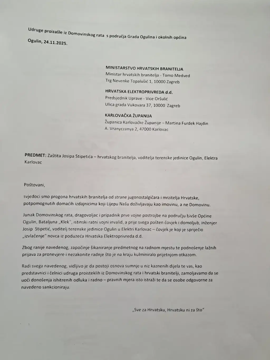 Žalosno je i to što mu, navodno, u trenucima kada se našao u nevolji, nije mu pružio potporu ni vrh Udruge branitelja HEP-a, čiji je donedavno bio član. Očito je da u pozadini svega stoje pokvareni političari i osobni interesi pojedinaca”-navodi se u članku, a kasnije dodaje i to da su udruge proizašle iz Domovinskog rata s područja grada Ogulina i okolnih općina uputile pismo Ministarstvu hrvatskih branitelja, Upravi HEP-a i županici Karlovačke županije, pod naslovom “Zaštita Josipa Stipetića – hrvatskog branitelja, voditelja terenske jedinice Ogulin, Elektra Karlovac”, dajući mu podršku – navodi se u članku Saborsko.net. (foto:saborsko.net)