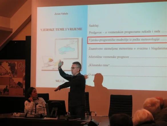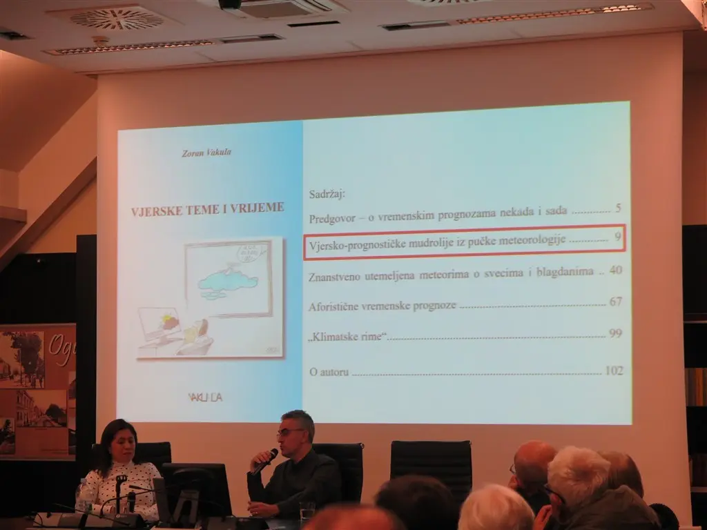 Kroz gotovo dvosatno druženje s Ogulincima govorio je o vremenskim ekstremima, evidentnim klimatskim promjenama i njihovim posljedicama, metodama pomoću kojih se rade vremenske prognoze. Dotakao se razno raznih meteo aplikacija, a, čitajući dijelove iz svoje zbirke “Vjerske teme i vrijeme”, progovorio je i o puzdanosti pučke meteorologije.
