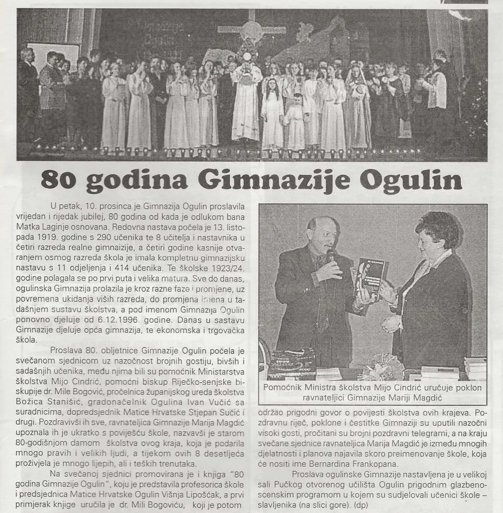U povodu obilježavanja održana je svečana sjednica na kojoj je promovirana knjiga “80 godina Gimnazije Ogulin”, a potom i prigodan program.