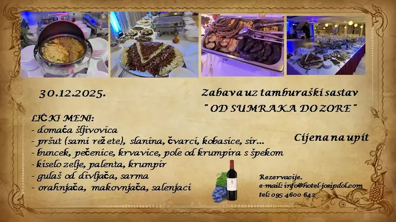 Središnji dio večeri rezerviran je za bogatu zimsku trpezu: buncek, pečenice, krvavice, polovice krumpira sa špekom, kiselo zelje koje grije poput peći, palentu i krumpir. Poslužit će se i gulaš od divljači, a nezaobilazna je i sarma – neprikosnovena zvijezda svakog zimskog stola.