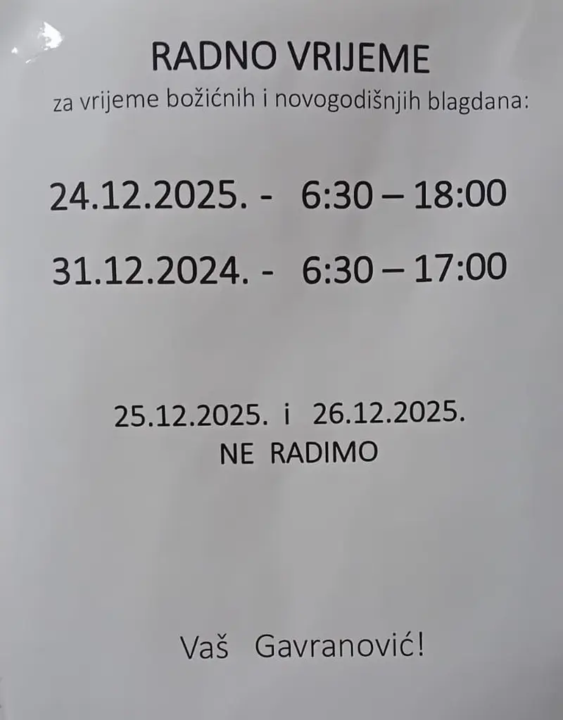 Trgovine Gavranović na Badnjak rade od 06:30 do 18:00 sati, a 25. i 26.12 2025. neće raditi.