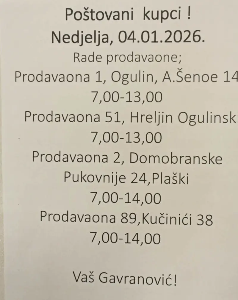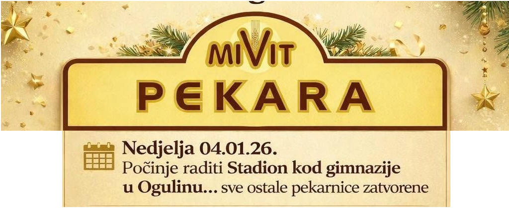 Aktualno OG sada Ogulin PROMONedjeljna kupovina kruha i još ponečeg… 3. siječnja 2026.Evo i prvog ovogodišnjeg vikend šoping infa. Dakle, zatreba li vam ove nedjelje neka kupovina u trgovini – donosimo radna vremena trgovina Gavranović. Po kruh možete u MIVIT – radit će prodajno mjesto kod gradskog stadiona.