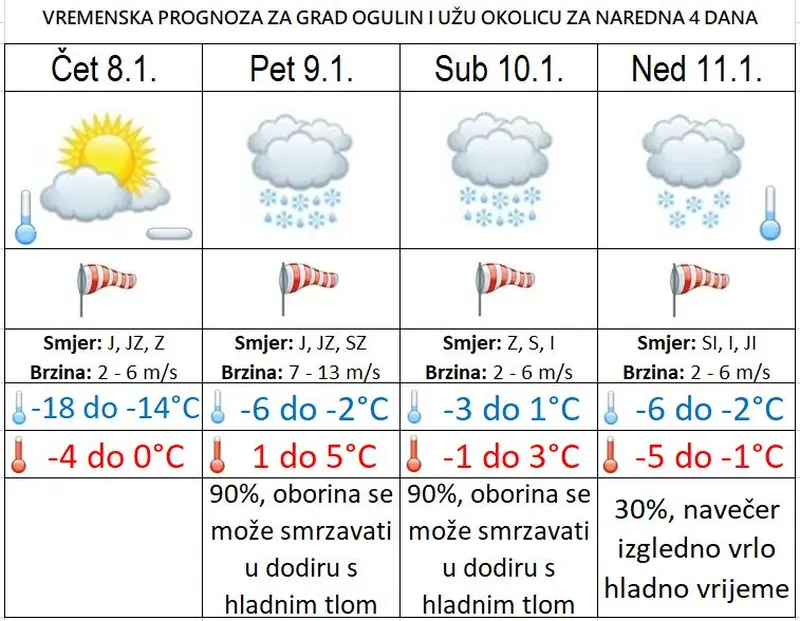 Vjetar većinom slab. Na Jadranu umjeren do jak sjeverozapadni, uz obalu i bura, a na krajnjem jugu do jutra i jugo te jugozapadnjak. Najniža temperatura zraka između -4 i 1, na Jadranu od 4 do 9 °C. Najviša od 0 do 6, na Jadranu od 8 do 12 °C.