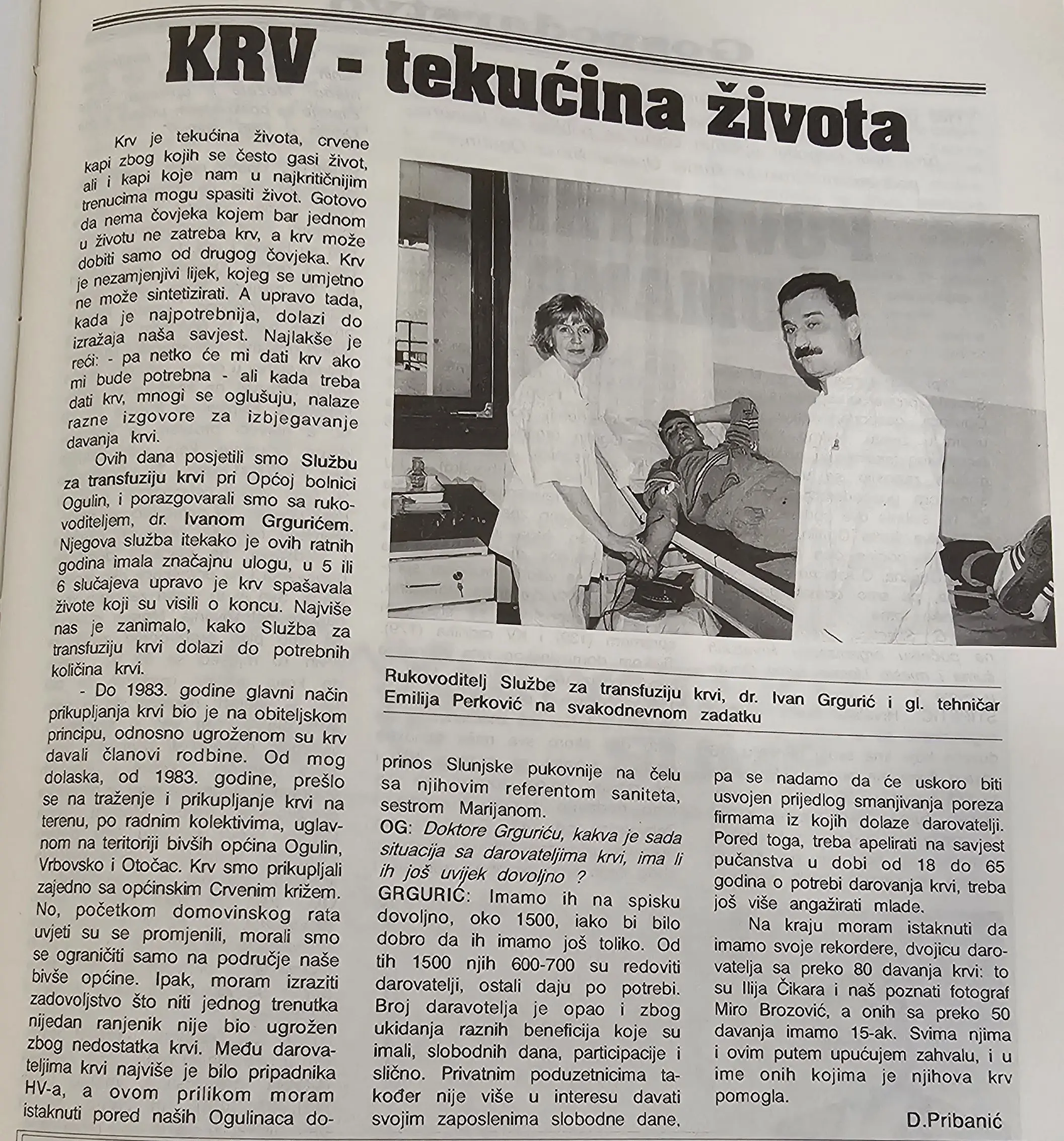 U današnjoj rubrici “Iz novinarske arhive” vraćamo se u 1995. godinu. Tada je, u mjesecu prosincu, u Ogulinskom listu, objavljen članak o Službi za transfuziju krvi pri Općoj bolnici Ogulin, kojoj je na čelu bio dr. Ivan Grgurić. Na koji se način tada prikupljala krv, možete pročitati u nastavku.