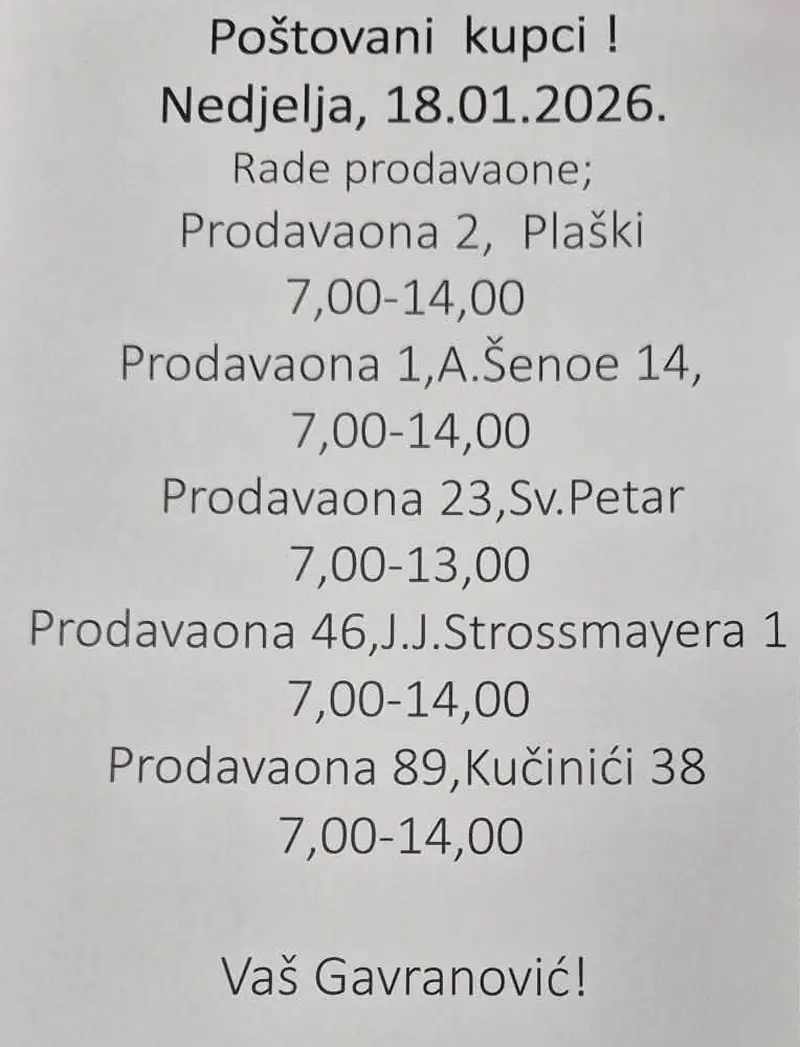 Aktualno OG sada Ogulin PROMOGdje po kruh i u trgovinu ove nedjelje? 17. siječnja 2026.Sutra je nedjelja, što znači da je sada prilika za nedjeljni šoping info pa evo kako sutra rade trgovine Gavranović, a kako pekara MIVIT.