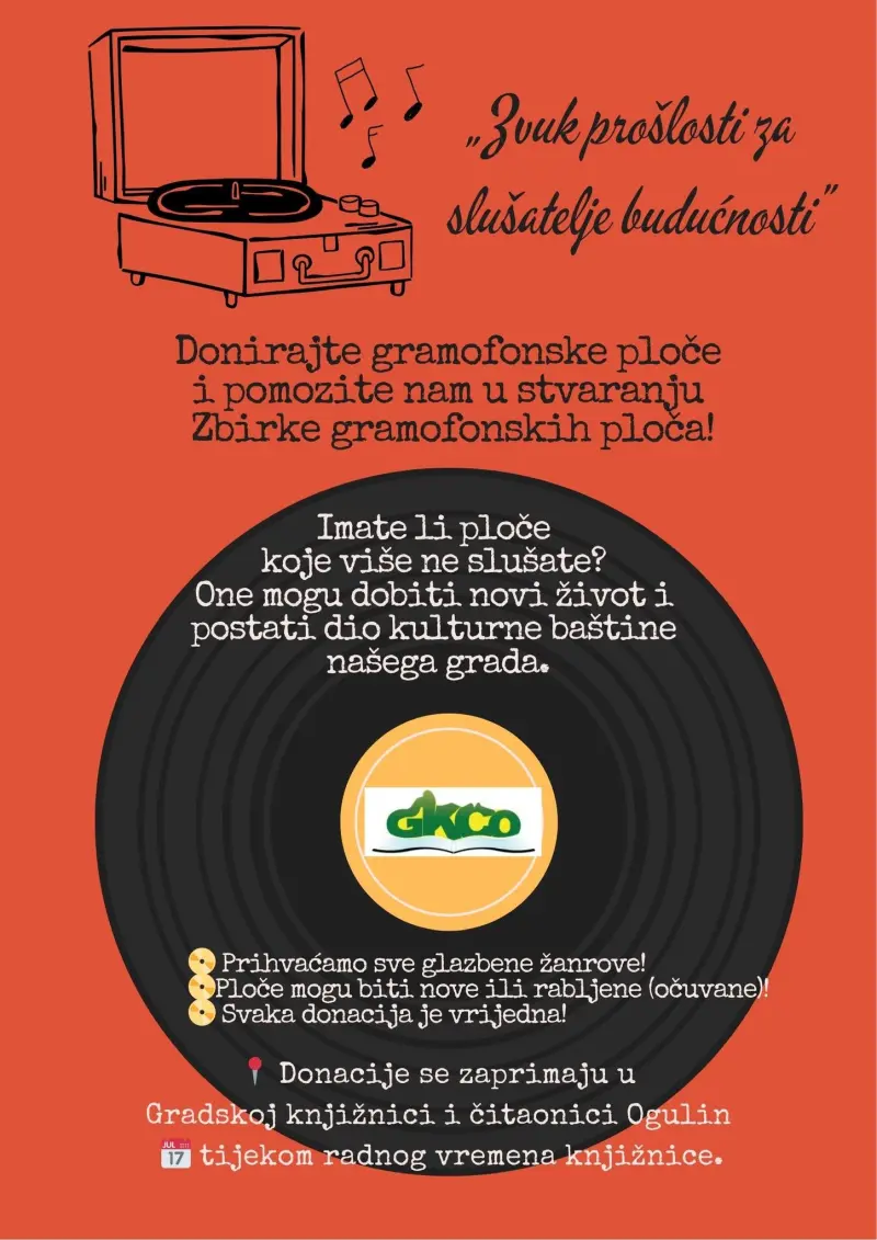 Gradska knjižnica i čitaonica Ogulin uputila je javni poziv svim građanima da donacijom gramofonskih ploča sudjeluju u osnivanju nove Zbirke gramofonskih ploča, koja će postati dio bogate kulturne ponude knjižnice i biti dostupna svim korisnicima.