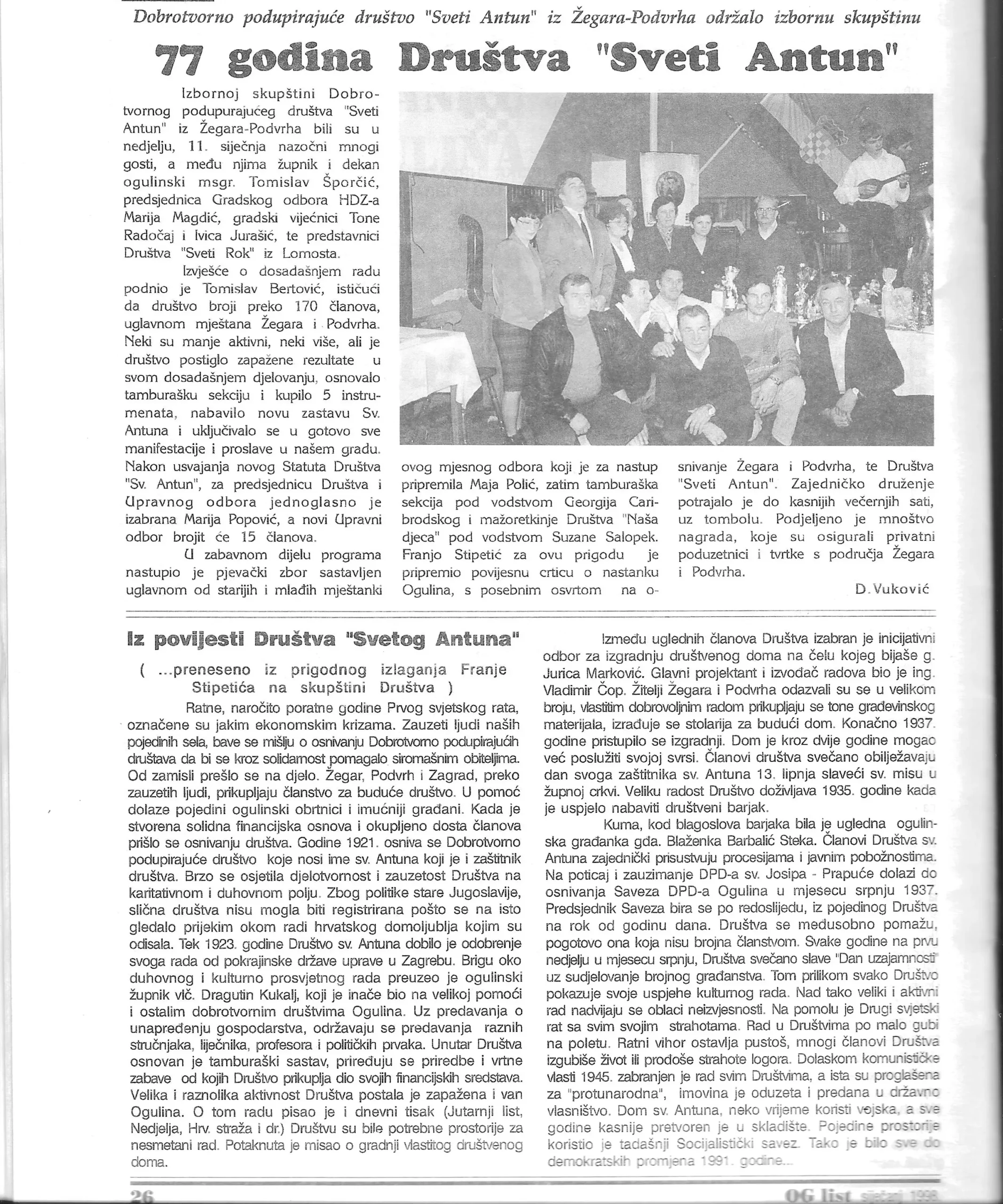 U siječnju 1998. godine DPD “Sv. Antun” Iz Žegar-Podvrha obilježio je 77. godišnjicu postojanja. Održana je tada izborna skupština, na kojoj je rečeno da DPD broji 170 članova. Nakon radnog dijela, održan je i zabavni dio programa. Više o svemu možete pročitati u članku koji je u siječnju 1998. objavljen u Ogulinskom listu.