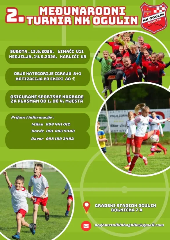 U lipnju će se na Gradskom stadionu u Ogulinu održati 2. Međunarodni turnir NK Ogulin za dječake, i to u dvije dobne kategorije. U subotu, 13. lipnja 2026., na teren izlaze limači U11, dok je u nedjelju, 14. lipnja 2026., na rasporedu natjecanje za karliće U9. Obje kategorije igraju u formatu 8+1, a za najbolje ekipe osigurane su sportske nagrade za plasman od 1. do 4. mjesta.