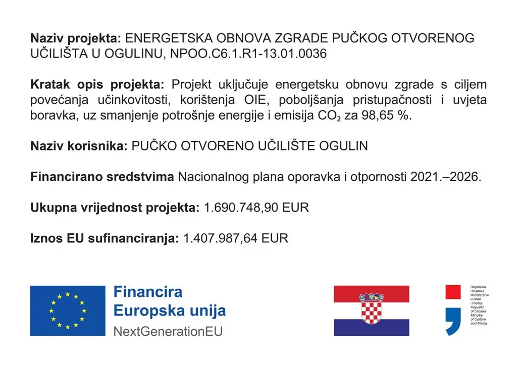 Radove izvodi tvrtka MONTEL d.o.o.. Projektnu prijavu izradili su Pučko otvoreno učilište Ogulin, Grad Ogulin i Razvojna agencija Karlovačke županije KARLA. Pučko otvoreno učilište Ogulin obavještava sve korisnike da zbog provedbe projekta „Energetska obnova zgrade Pučkog otvorenog učilišta Ogulin u Ogulinu“ prostori Učilišta privremeno neće biti dostupni za korištenje. Zahvaljuju svima na razumijevanju i strpljenju tijekom trajanja radova.