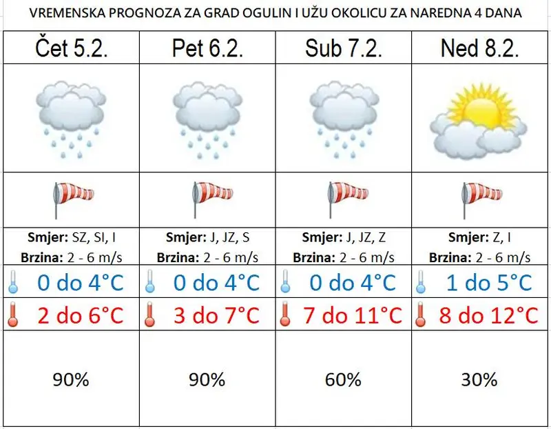 U subotu promjenljivo, u unutrašnjosti i pretežno oblačno. Mjestimice kiša, na Jadranu i pljuskovi, osobito na jugu može biti i grmljavine. Na kopnu je ponegdje moguća magla, u najvišem gorju i susnježica ili malo snijega. Vjetar većinom slab, na Jadranu mjestimice umjeren sjeverozapadni i bura, poslijepodne i jugo i jugozapadni. Najniža jutarnja temperatura između 2 i 6, na moru 7 i 11, a najviša dnevna od 7 do 12, na Jadranu 11 do 16 °C.