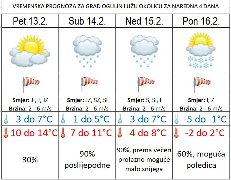 U subotu na Jadranu i u predjelima uz njega umjereno do pretežno oblačno s kišom, lokalno obilnom, te izraženijim pljuskovima s grmljavinom, osobito u drugom dijelu dana. U središnjim i istočnim predjelima postupno naoblačenje sa zapada, uglavnom poslijepodne mjestimice kiša. Ujutro na kopnu ponegdje magla. Vjetar slab, na istoku do umjeren jugoistočni, navečer sjeveroistočni. Na Jadranu vjetrovito uz jako i olujno jugo koje će u drugom dijelu dana na sjevernom dijelu slabjeti i okrenuti na buru. Najniža temperatura zraka između 1 i 6, a na Jadranu od 7 do 11 °C. Najviša dnevna većinom između 9 i 14 °C, u Gorskoj Hrvatskoj i malo niža.