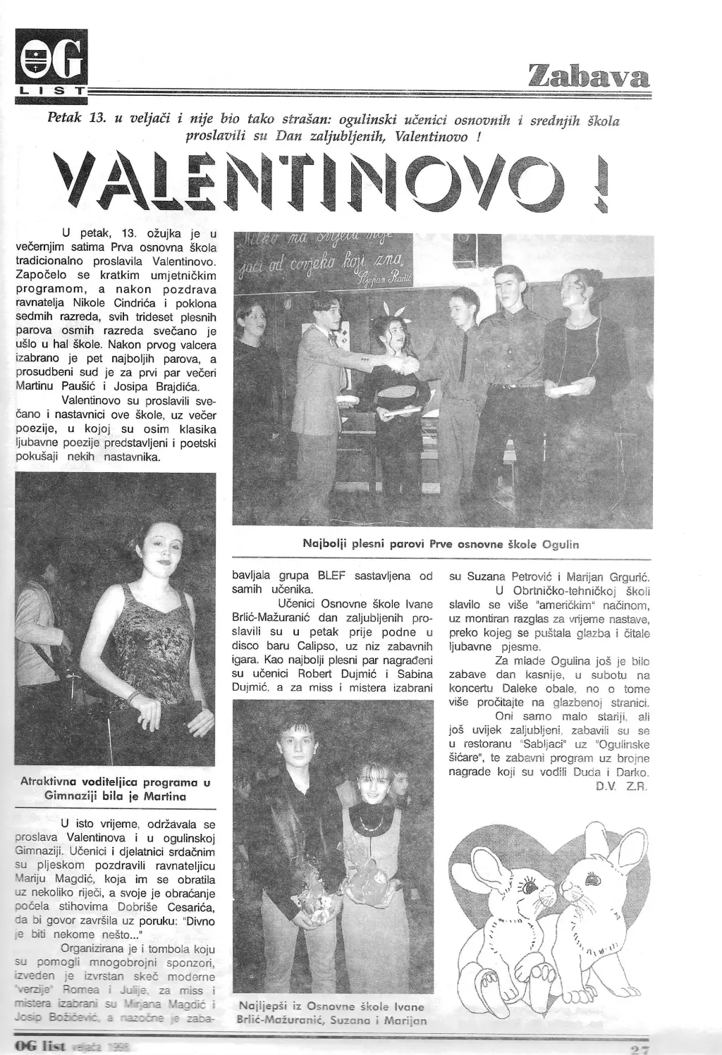 Iza nas je Valentinovo. Stoga smo odlučili zaviriti u prošlost i vidjeti kako se ovaj dan zaljubljenih obilježavao prije. Pronašli smo članak objavljen u Ogulinskom listu 1998. godine. Zanimljivo, proslava je održana u petak, 13. veljače, u svim ogulinskim školama, osnovnim i srednjim. Dan kasnije održan je i koncert Daleke obale, a oni nešto stariji zabavljali su se u restoranu Sabljaci.