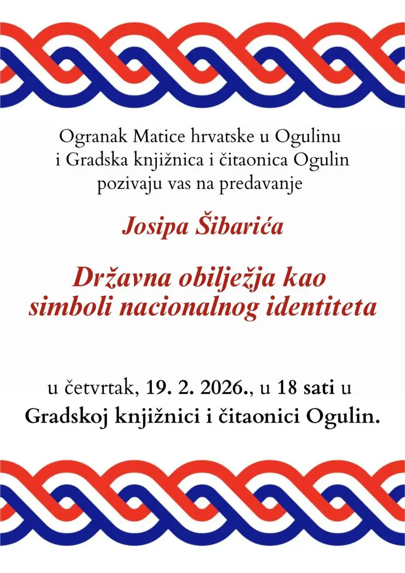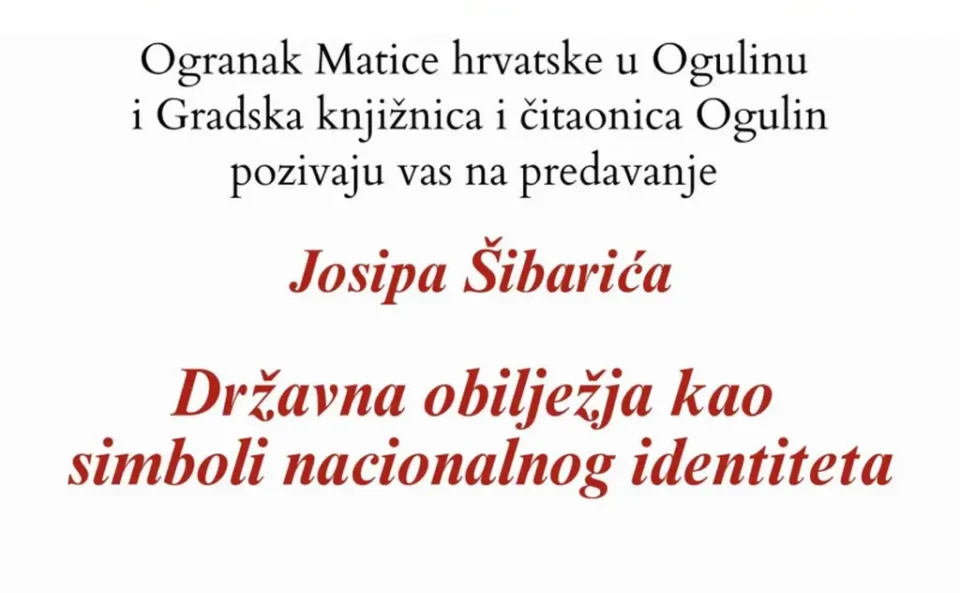 Matica hrvatska u Ogulinu i Gradska knjižnica i čitaonica Ogulin organiziraju predavanje Josip Šibarića pod nazivom „Državna obilježja kao simboli nacionalnog identiteta“.