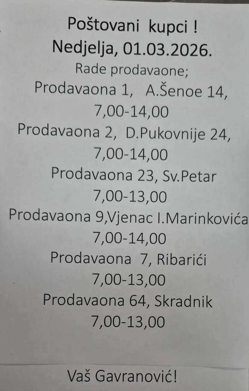 Aktualno OG sada OgulinNedjeljna kupovina 28. veljače 2026.Kada i gdje možete kupiti kruh u MIVITU ili nešto od mješovite robe u trgovinama Gavranović, sutra, prve nedjelje u ožujku, saznajte u nastavku.