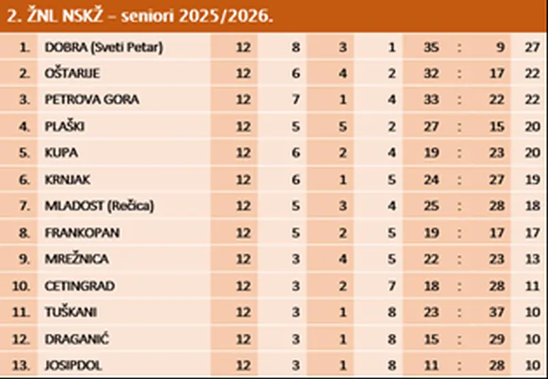 U 14.kolu Dobra je slobodna, Oštarije će ugostiti momčad Frankopana iz Brežana, Plaški igra u Donjem Mekušju kod Kupe, a Josipdol u Karlovcu kod Tuškana.